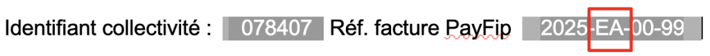 - La référence de la facture à saisir est de la forme 2025-EA-00-XXX et non 2025-AE-00-XXX comme indiqué sur votre facture. AE doit être remplacé par EA. XXX est votre numéro de facture.